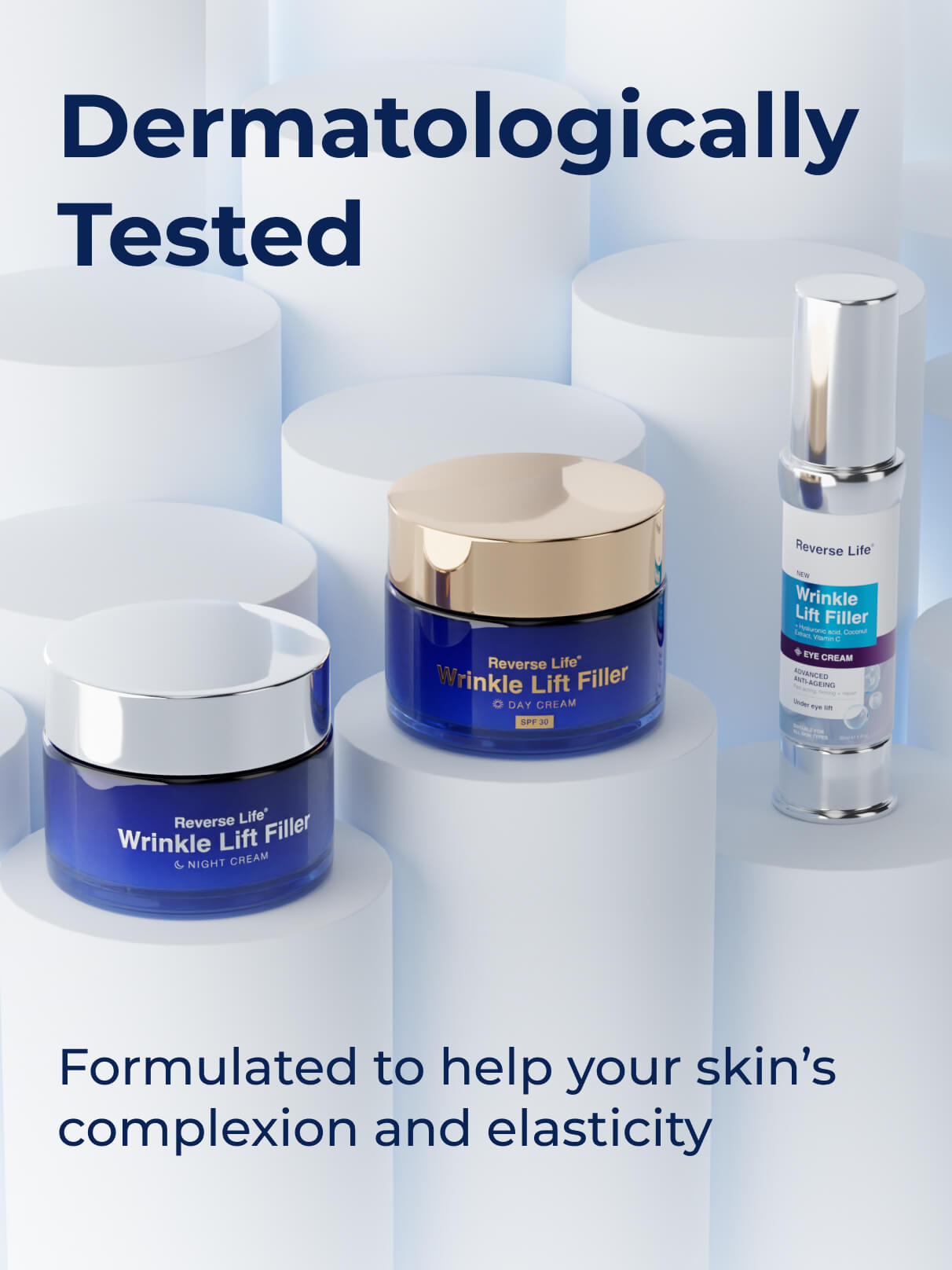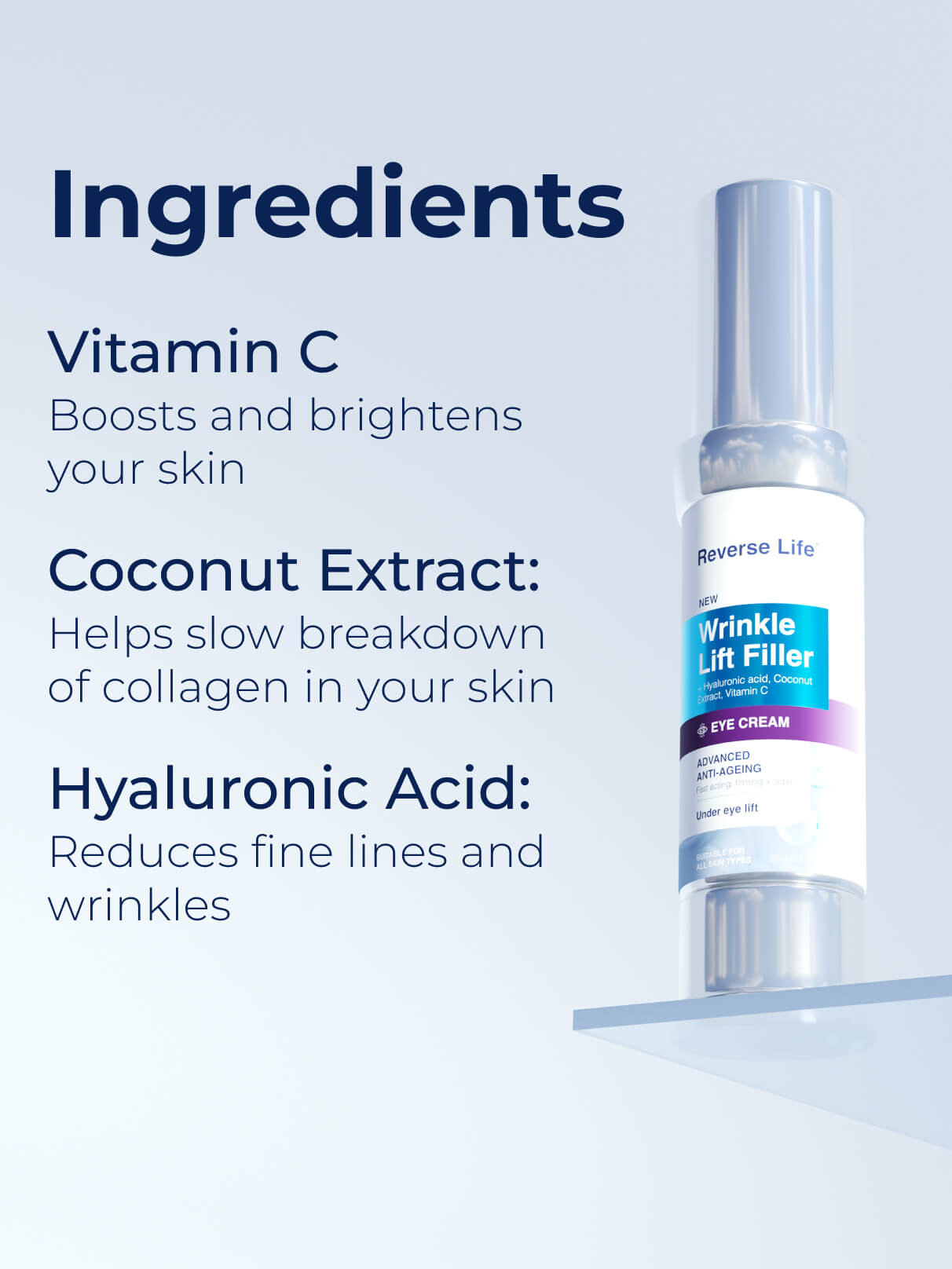 Our Reverse Life Wrinkle Lift Filler Eye Cream is precisely what you need to slow down the signs of under-eye ageing, and effectively tackle emerging fine lines, wrinkles and crow’s feet.