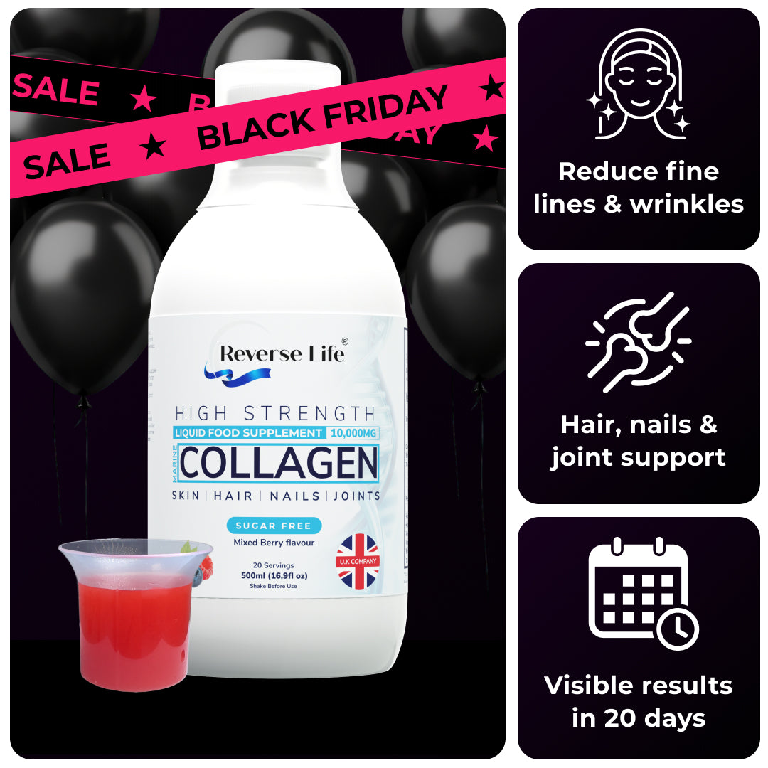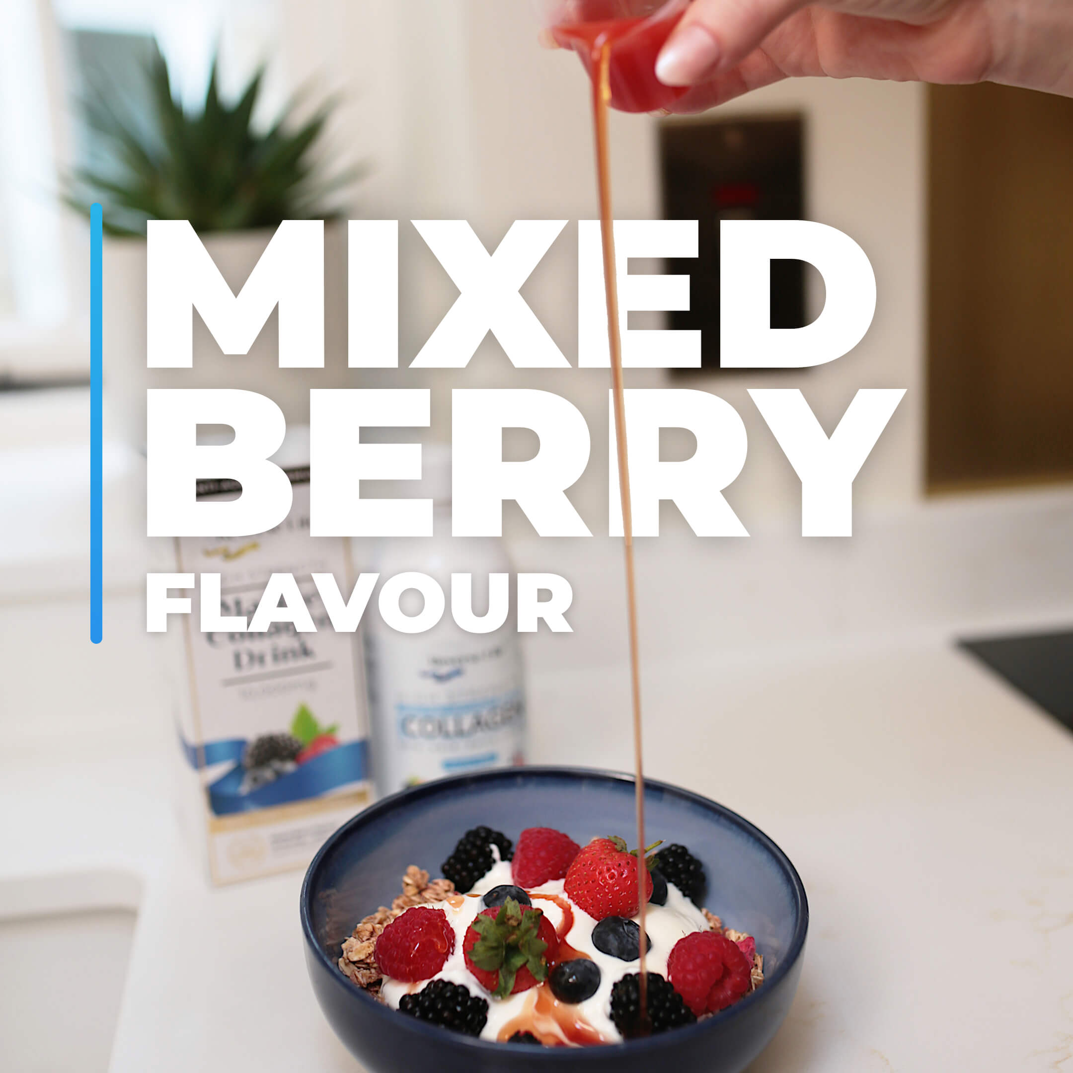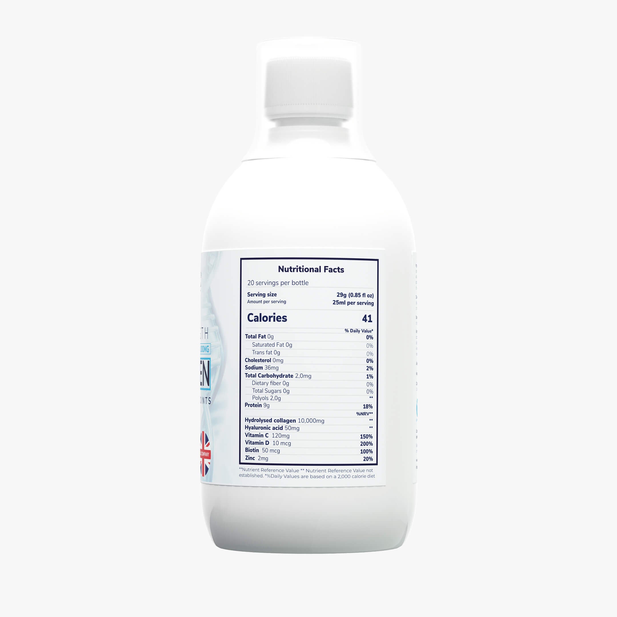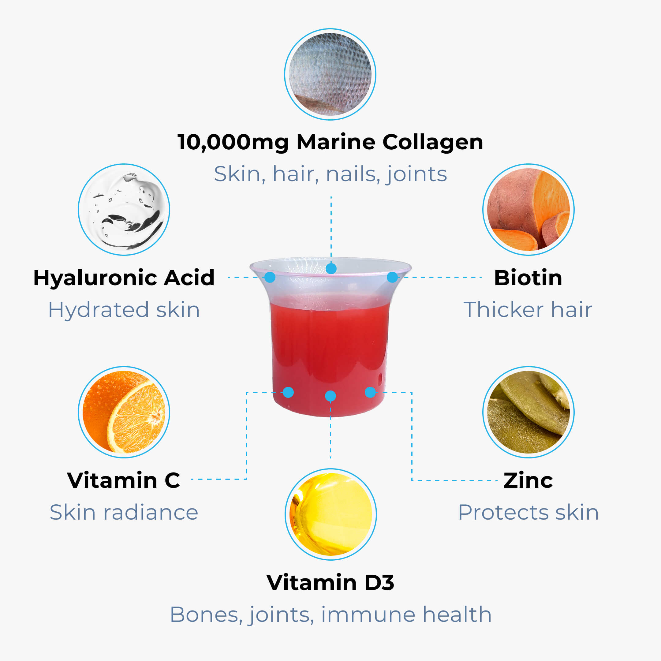 Water, hydrolysed collagen(FISH), sweetener: xylitol, vitamin C (sodium ascorbate), acids: citric, malic and phosphoric, flavours, hyaluronic acid sodium, colour: lycopene from red tomatoes, zinc (zinc gluconate), preservatives: potassium sorbate, sodium benzoate, sweetener: sucralose, vitamin D (cholecalciferol), biotin (D-biotin)