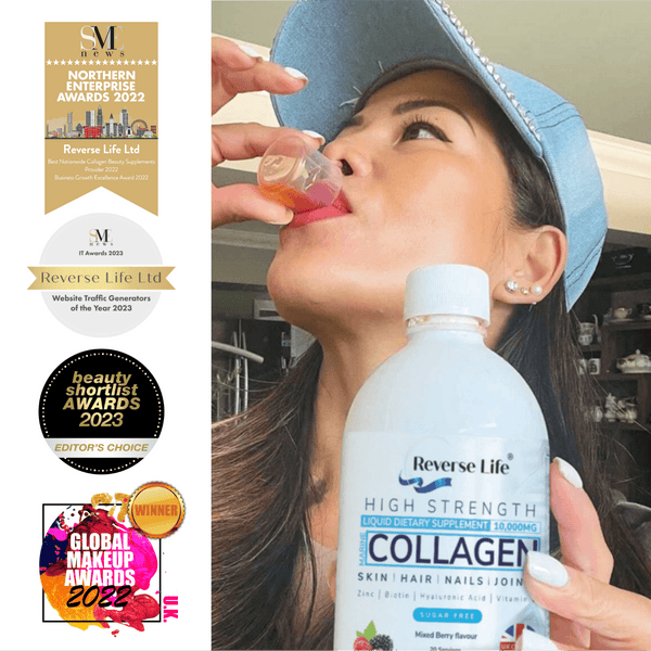 Collagen combined with Hyaluronic acid and Biotin (as it is in the Reverse Life formula) can also help peri and menopausal women combat a range of common issues including joint pain, loss of skin hydration, dryness and itching as well as thinning hair and brittle nails.