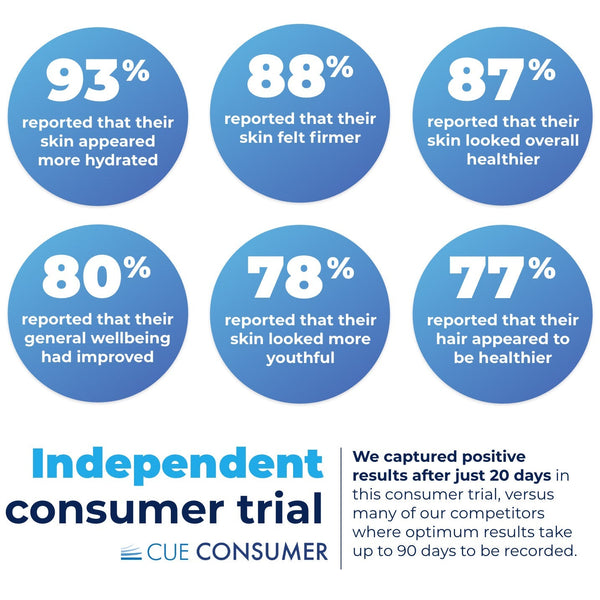 In an independent trial carried out with Cue Consumer, they assessed the overall efficacy of our Reverse Life collagen supplement. Positive benefits were experienced for skin, hair, nails and joints in just 20 days.