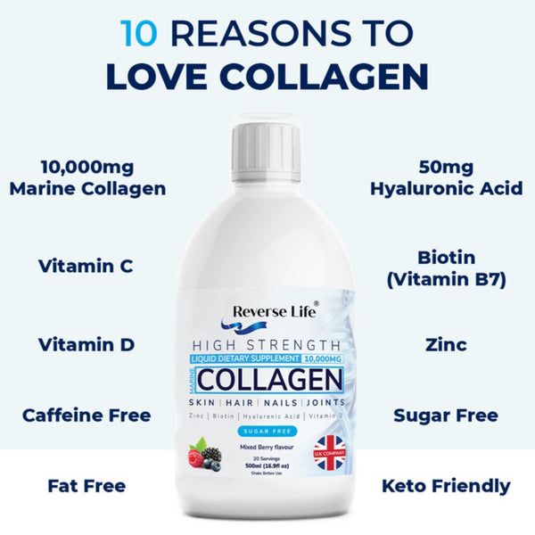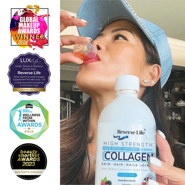 Collagen combined with Hyaluronic acid and Biotin (as it is in the Reverse Life formula) can also help peri and menopausal women combat a range of common issues including joint pain, loss of skin hydration, dryness and itching as well as thinning hair and brittle nails.