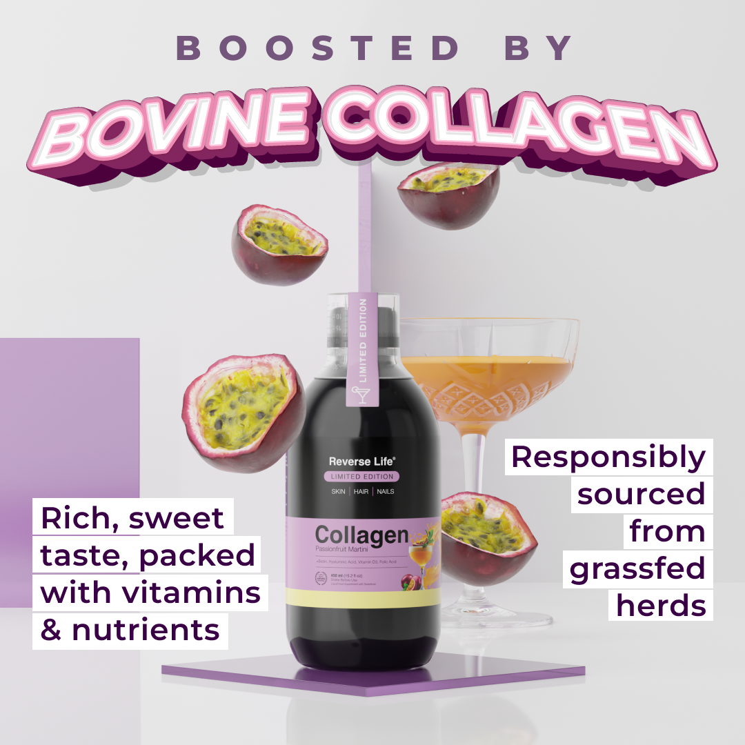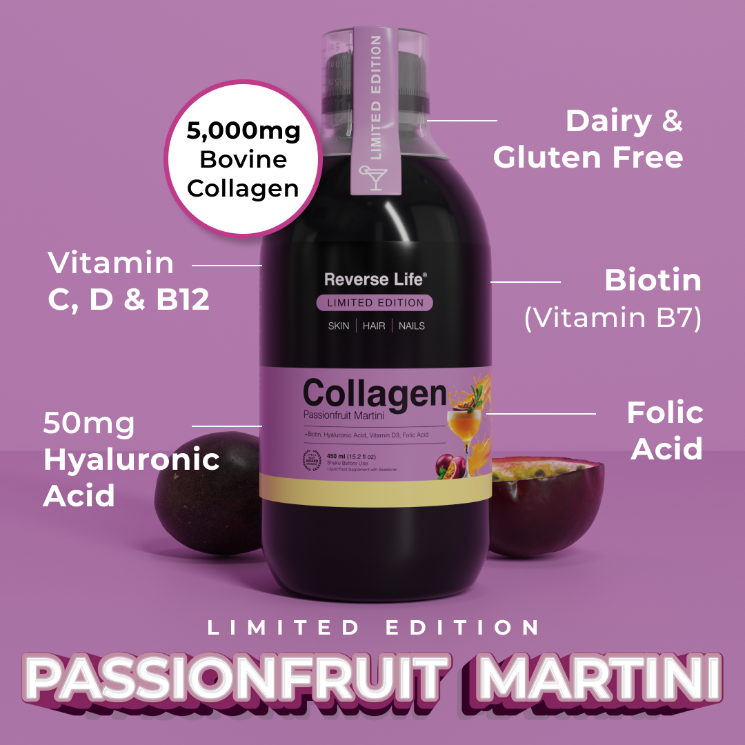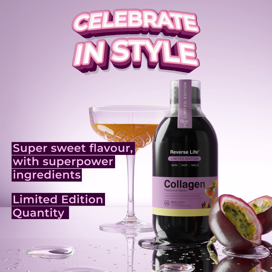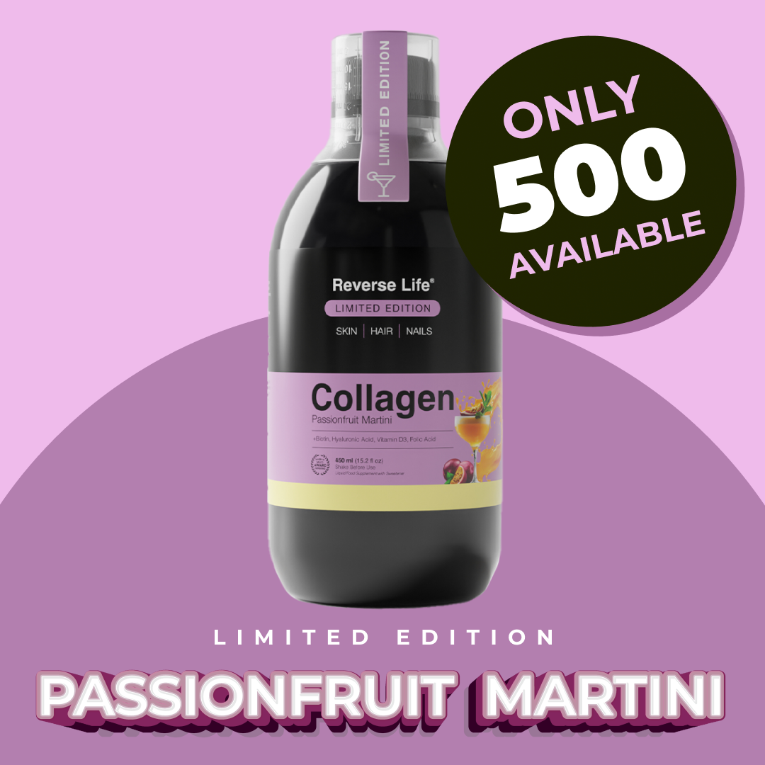 Only 500 bottles of this limited edition treat are available - this is an absolute must-have for collagen lovers. Indulge in your skin, relax your hair, and renew your nails with our Passionfruit Martini-flavoured Collagen.
